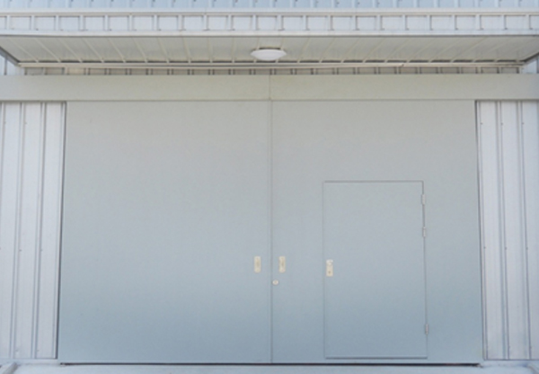 (3)平开式电动钢大门:采用电动推杆式作为门的开启动力,由门框、门扇(双扇)、电机驱动装置等组成。其启闭操作由装在室外的按钮箱及室内的电控箱控制。门的开启、关闭、密封实现了电控化,操作简单,方便实用。钢大门的尺寸可以制作单扇宽超过10米、高超过8米,重量达10吨的超大型钢门。超大门还可以根据环境需要,增加其他功能,如气密性要求、防火隔热性要求、抗台风要求、抗冲击功能要求、抗震要求等等。